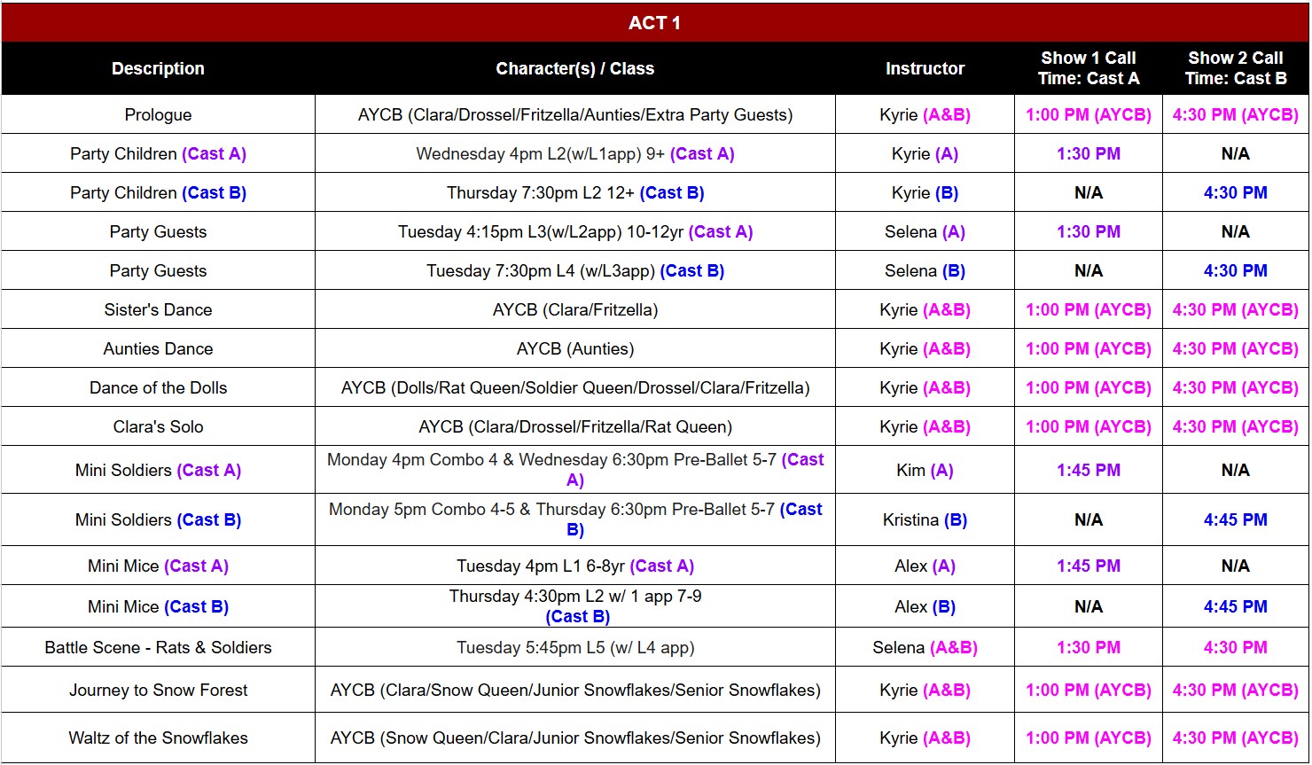 Dress Rehearsal will run out of order: Please note the call times, including the color coded list at the bottom of the page. Please see the order & call times below. Class photos taken right after they rehearse their dance, and will be dismissed after the photo.