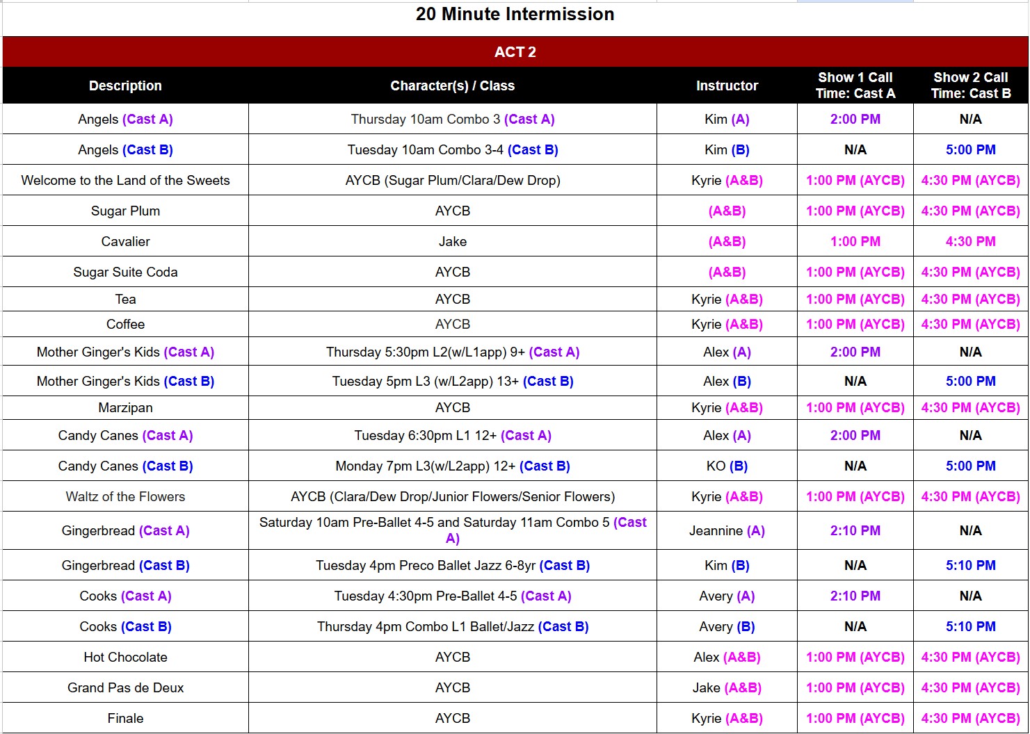 Dancers performing in both shows (A & B) may check out from the backstage area during the breaks between shows, however must remain on St. Andrew’s campus and be checked back in by the call times listed below for their next show.