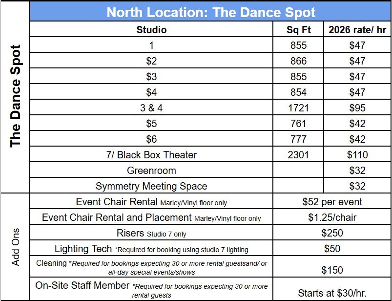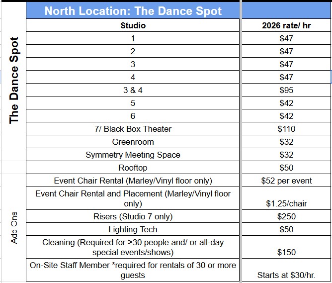 Studios may be used for dance rehearsals, private lessons, pop-up classes, auditions, workshops, theater rehearsals, fitness or movement-based classes, filming, photography, and other creative uses that align with our facility guidelines.