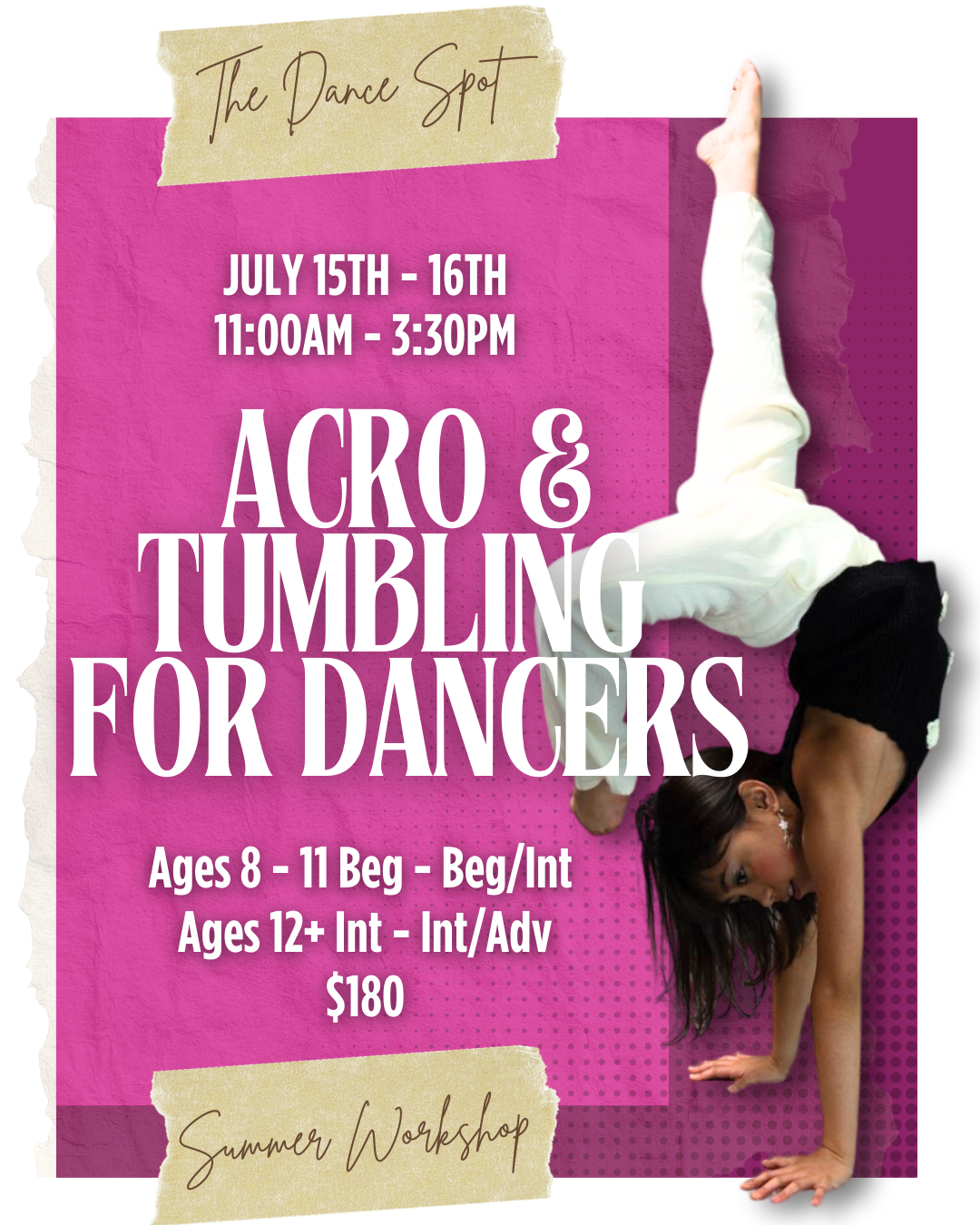 A dynamic workshop designed to safely develop acro & tumbling skills specifically for dancers. Participants will focus on strength, flexibility, coordination, & proper technique while progressing through foundational & intermediate acro skills. Emphasis is placed on alignment, control, and injury prevention for confident integration into choreography. Please note: Muscle soreness may occur following this strength-based, technical training, & is a normal part of the conditioning process.