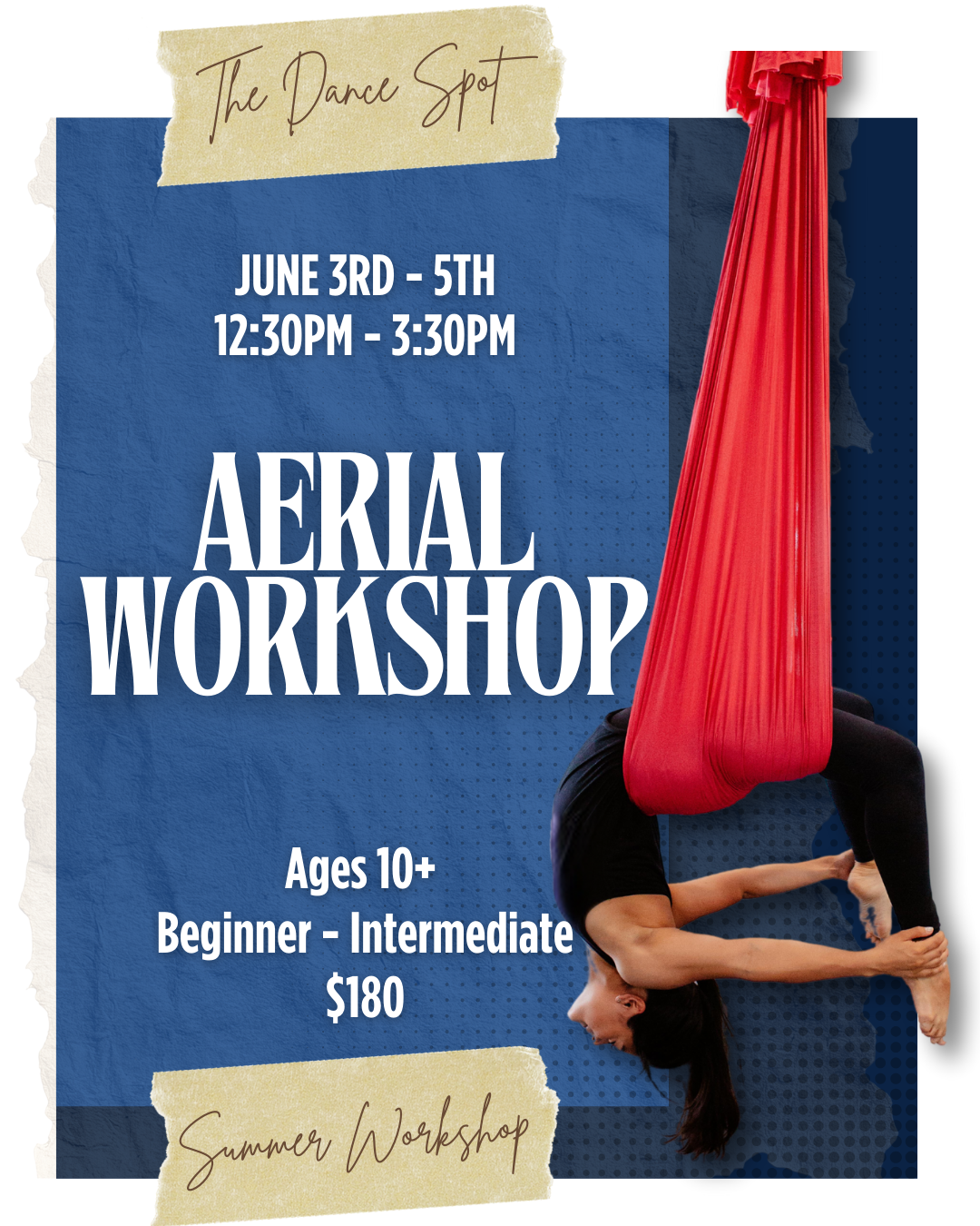 Join our aerial instructors for a three-day beginner–intermediate workshop in Sling Aerial (aerial hammock). Designed for students with little to foundational experience, this workshop explores climbs, creative transitions, dynamic choreography, and inverted sequences. Build core and upper-body strength while refining technique, flow, confidence, and artistry in the fabric.